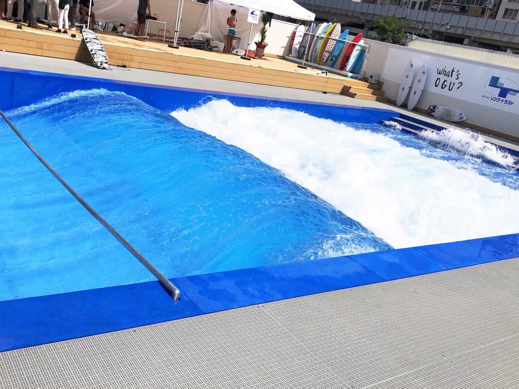 そして、なんといっても「スポル品川大井町」の目玉はサーフィン(50分6200円)!大きな人工波プールに唖然。このプール、アジア初上陸のドイツ製のもの。初心者向けの小さな波から、大きな波まで変幻自在なのだそう。