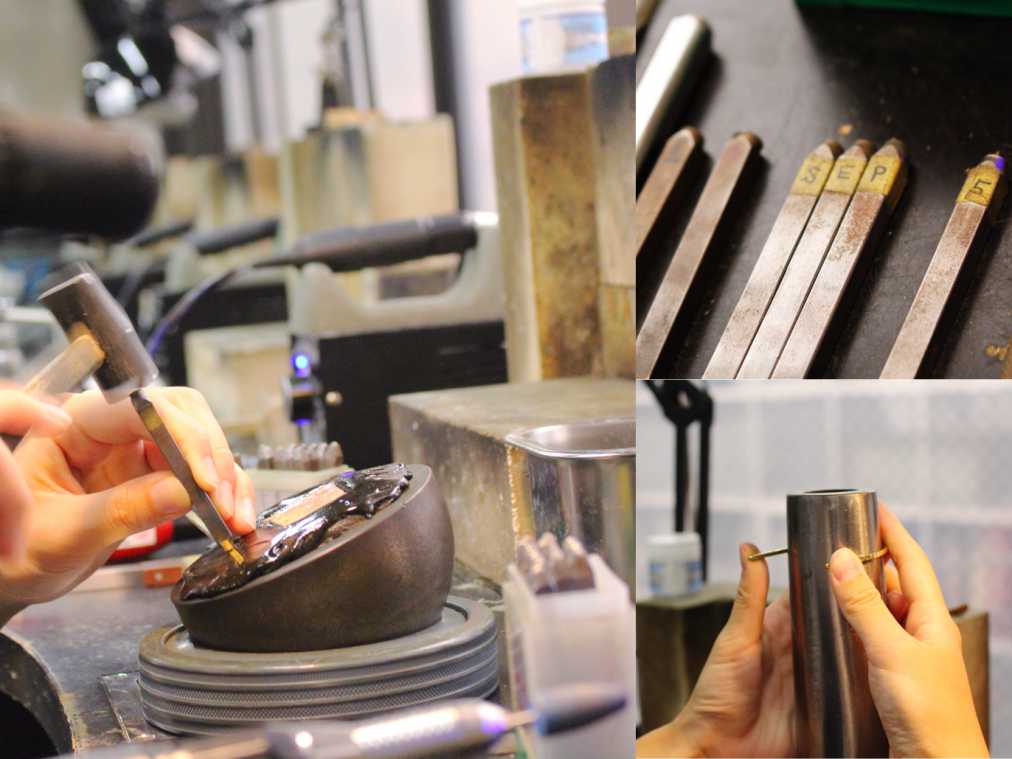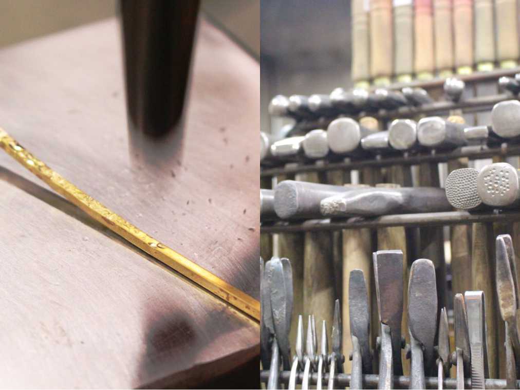 デザインを決めたら、バングル作りスタート!職人さんも実際に使う工房で行うため、見たことのない道具や機械がずらり。まるで職人になったような気分で体験することができます。エプロンの貸し出しもあるので、服が汚れる心配もありません!