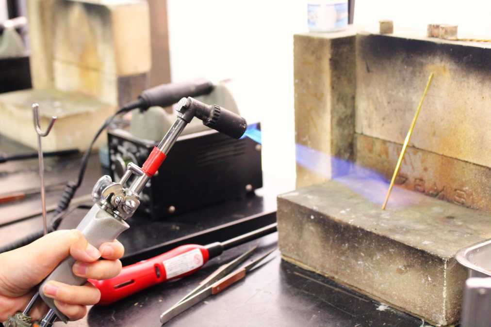 金属の棒をバーナーで炙って、加工しやすいように柔らかくしていきます。結構火が強く、勢いよく出る炎に思わずびっくりしてしまうほど!友達と一緒に体験すれば、2人でキャーキャー言いながらここでひと盛り上がりすること請け合いです。