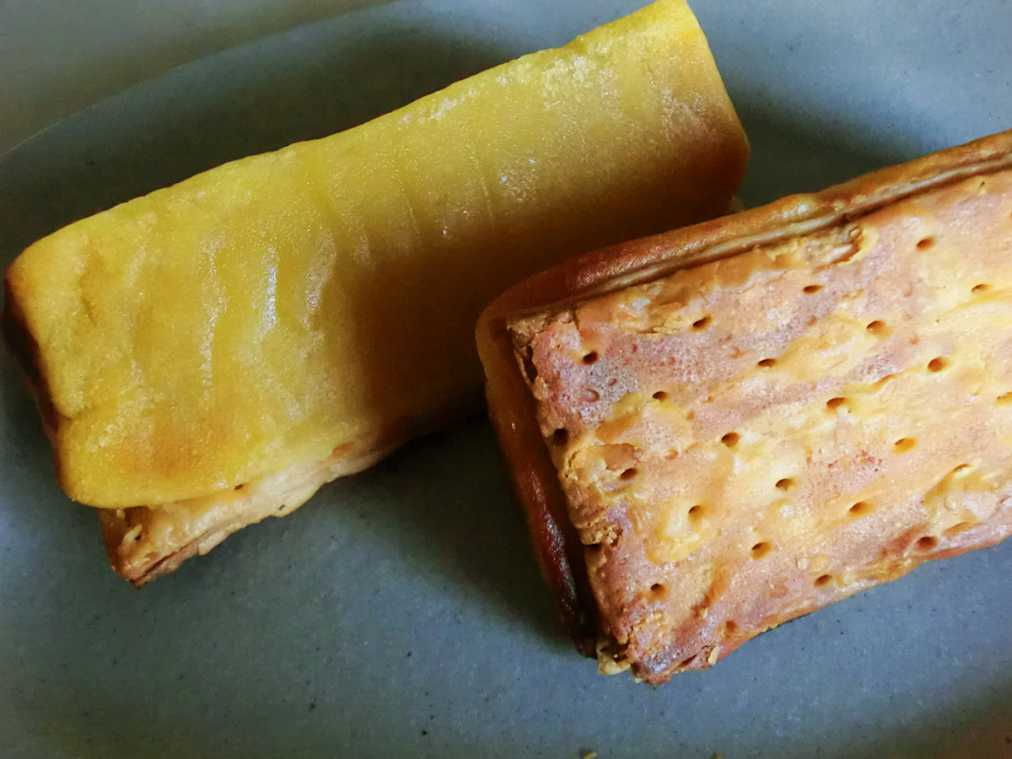 いよいよお待ちかねの「ポグ」とご対面!見た目はパイというより、スイートポテト。“パイ”というと一般的なパイ生地にフィリングを包んだスイートポテトパイを想像していたので、見たこともない“三角柱”というフォルムが意外です。