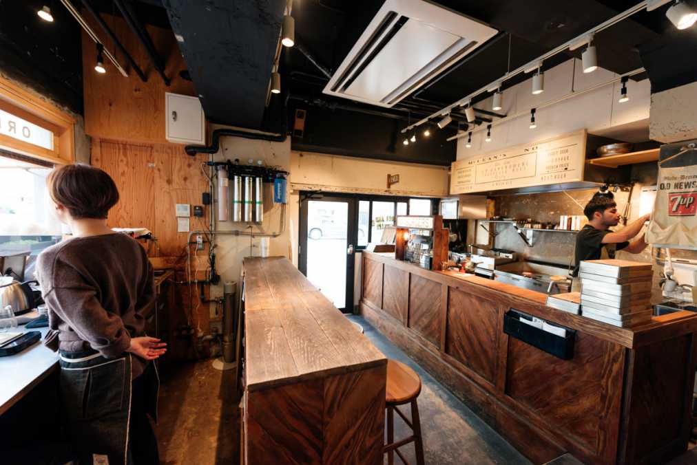 店内は、ぬくもり感溢れる木造り。同じくウッディな、ビッグサイズのカウンターが設置されています。オーナーの落合浩平さんによると、1900年代初頭の、アメリカの「バーガースタンド」を再現した造りなのだそう。
