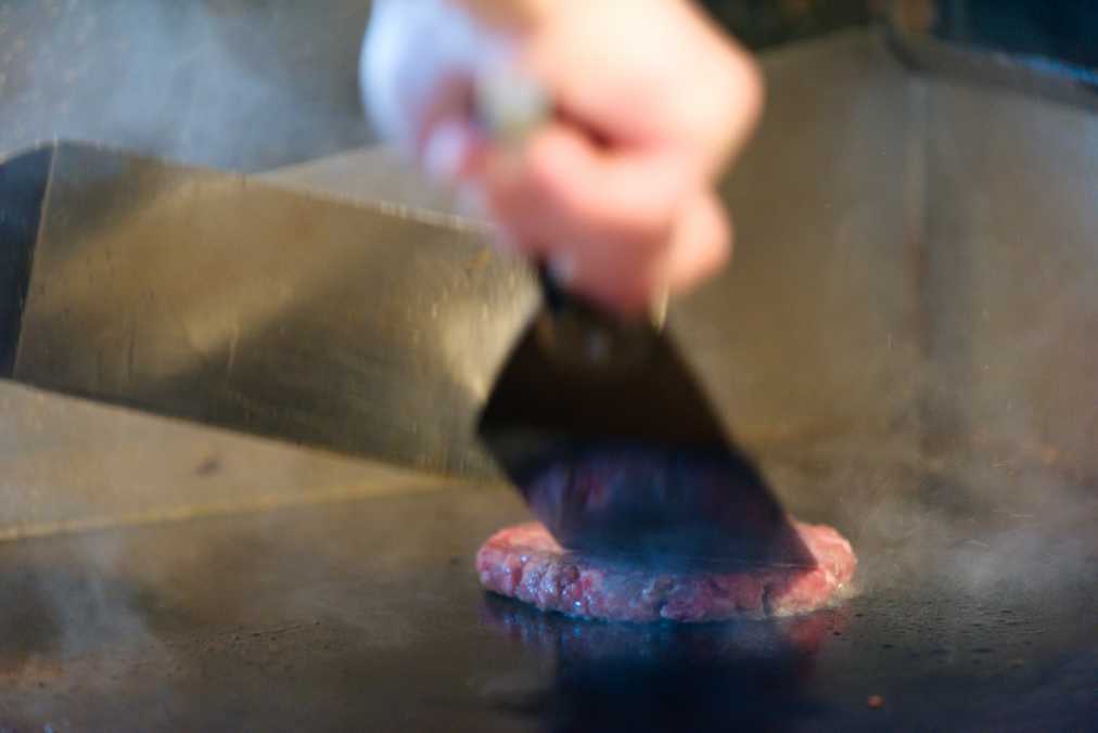 店内を満たすのは、肉が焼ける香り。入り口近くにあるキッチンをのぞくと、スタッフの方が手際よくパテを焼いている姿が目に入ります。