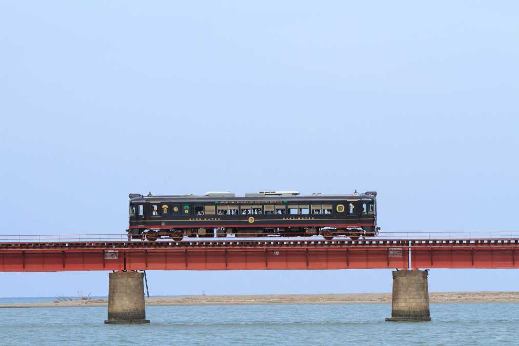 大人気の「丹後くろまつ号」は、天橋立の白砂青松を象徴する「松」がテーマの観光列車で、日本三景 天橋立と西舞鶴間(スイーツコースのみ福知山)を結びます。丹後鉄道の沿線で一番の絶景と言われる奈具海岸や由良川橋梁を運行。木目調のインテリアが温もりとやすらぎを与える車内には、テーブル席のほかにソファー席まであります。