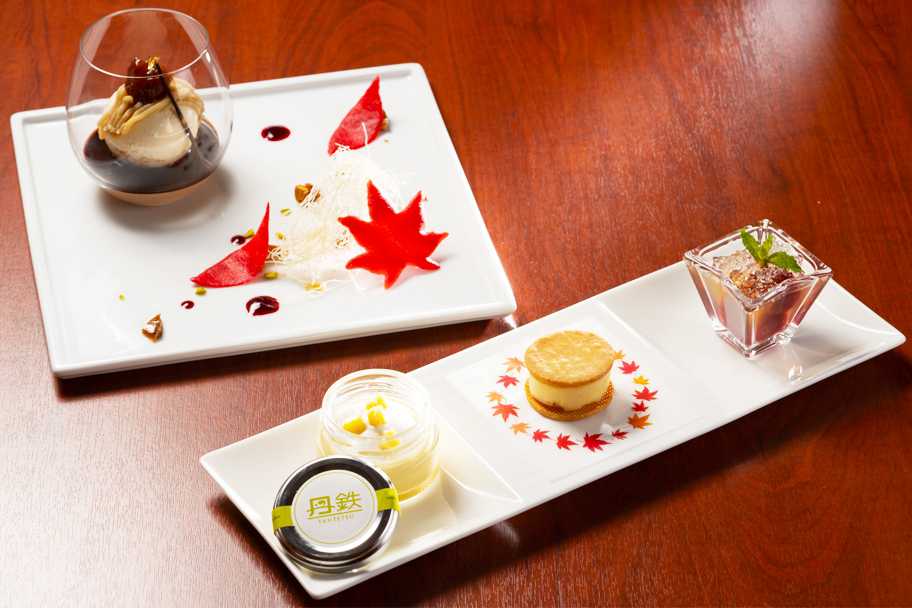 「久美浜産ピオーネのコンポートジュレ」や「グラスの中で再構築した丹波栗のモンブラン」など名前を聞いただけでおいしそうな4種のスイーツに1ドリンク付き。