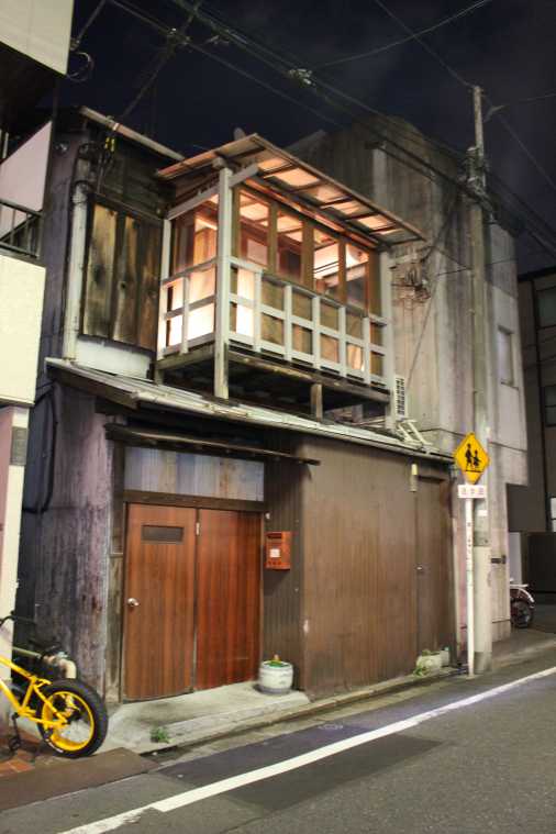 看板も表札もないお店の外観。本当にここでいいの?と心配になりますが、この隠れ家感がたまりません。1階は天ぷらの名店「天婦羅 みやしろ」、その2階に「くずし割烹 おにかい」があります。勝手口のような右のドアが入り口です。