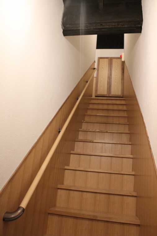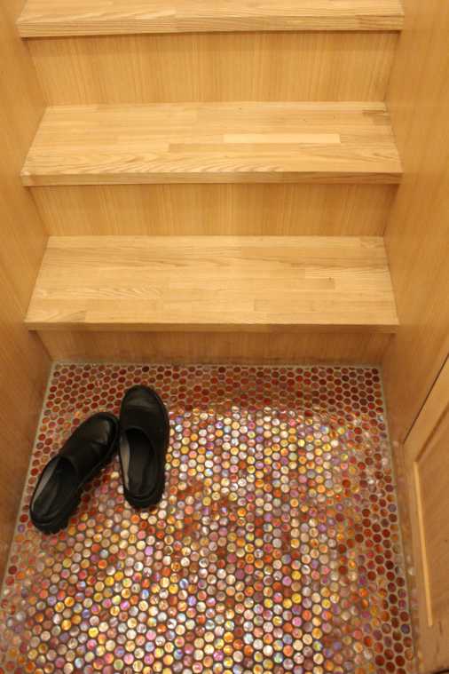 ドアを開けるとその外観からは想像もできないような清潔感あふれる空間に。かわいい丸タイルで靴を脱いで、2階へあがっていきます。