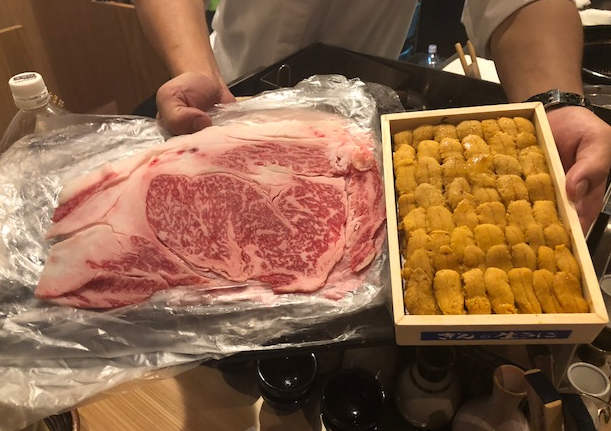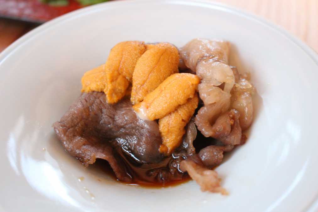 そして、メインは目の前で仕上げてくれる牛すきonうに1500円。和牛を割下にサッとくぐらせ、極上ウニをトッピング。高級食材のコラボレーションに感動の贅沢な一品。