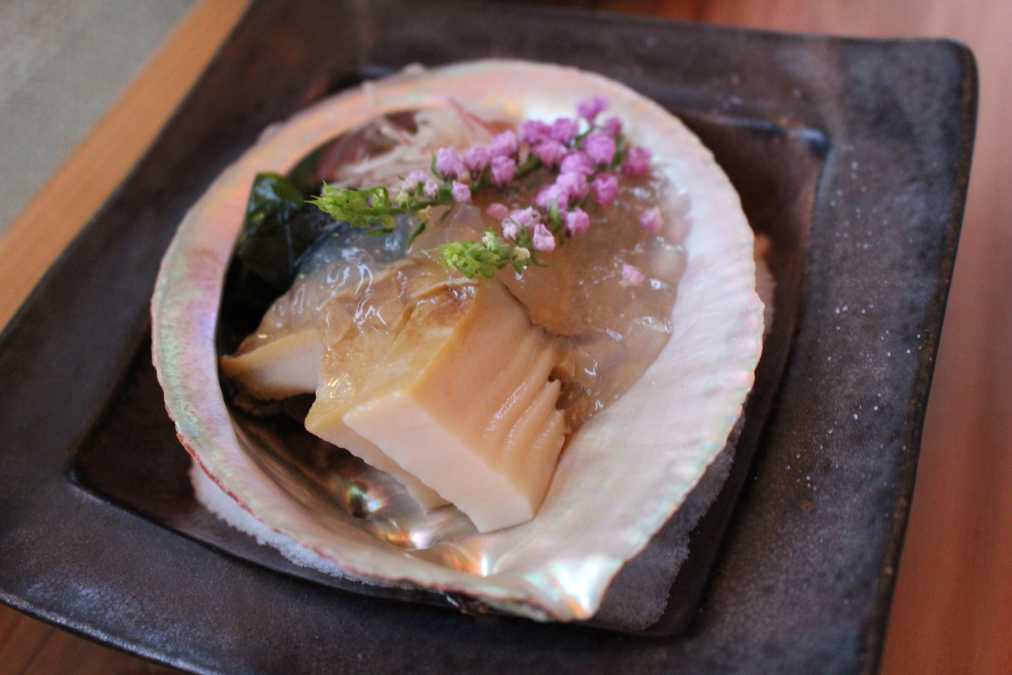 こちらは煮あわび(2300円)。活きた状態から約6時間ほど煮込んだ、やわらかいアワビに煮汁のジュレがかかる見た目も美しいお料理です。