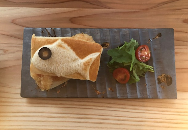 鯛の形に焼いた食パンがかわいいこちらは、1階の「天婦羅 みやしろ」のエビ天をはさんだエビ天サンド680円。エビ天のサクサクとパンのカリカリがよくあいます。