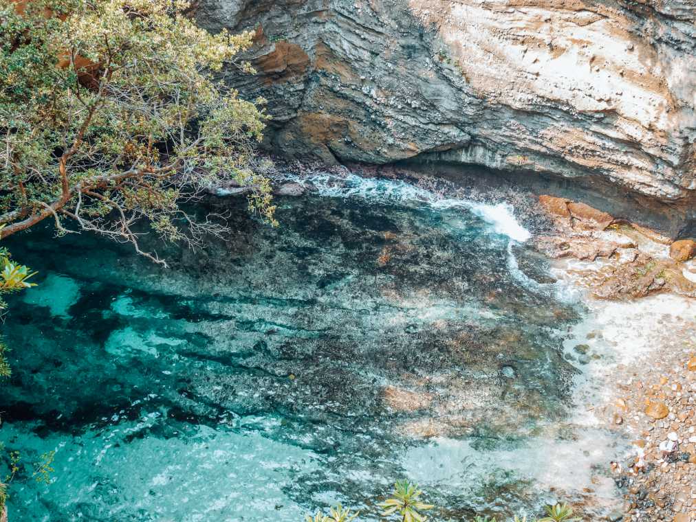 次に駐車場から階段を降りていくと、上から見る景色とは全く違う世界が広がっています。透明でエメラルドグリーンとコバルトブルーが入り混じった海の色、上から差し込む光の具合で変化する岩の色。洞窟の先に見える海がとても遠く感じられ、自然が作り上げた神秘の世界を味わうことができます