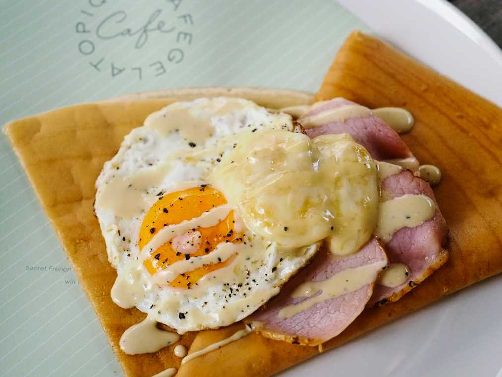 まろやかな卵の黄身、とろけるチーズ、そしてしっとりとしたハムを、サクサクモチモチのクレープといただくと…おいしい!サレソースのコクや酸味、ガーリックの香りが、具材と見事に調和しています。これは毎日でも食べたいぐらい!