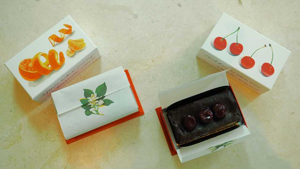 フルーツの甘酸っぱさと、テリーヌの口どけを同時に楽しむことができます。また、包みの紙にはそれぞれ、オレンジとさくらんぼの花が描かれているのもポイントです。女子のハートを掴む細やかな作りに、ときめきが止まりません。