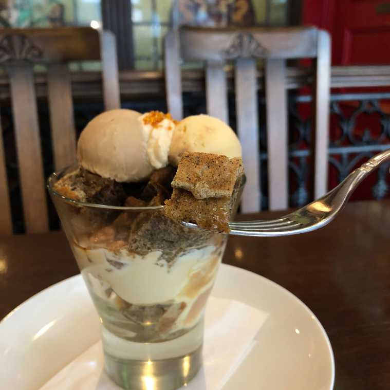 てっぺんには紅茶と洋梨&キャラメルの2種類のアイスがのり、その下にはアールグレイ風味のワッフル、ナッツ風味のメレンゲ、洋梨のプリザーブなどが隠れています。紅茶、キャラメル、洋梨の素材をふんだんに使ったスイーツを楽しむことができます。