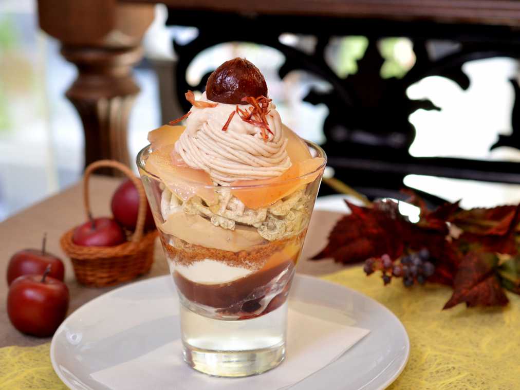 秋の「りんごと紅茶のモンブランパフェ」(ドリンクセット1950円)ではアイスやプリン、メレンゲやゼリーなど、さまざまな紅茶味のスイーツをふんだんに使い、秋の味覚“栗”と“りんご”とのマリアージュを楽しめる贅沢なパフェとなっています。