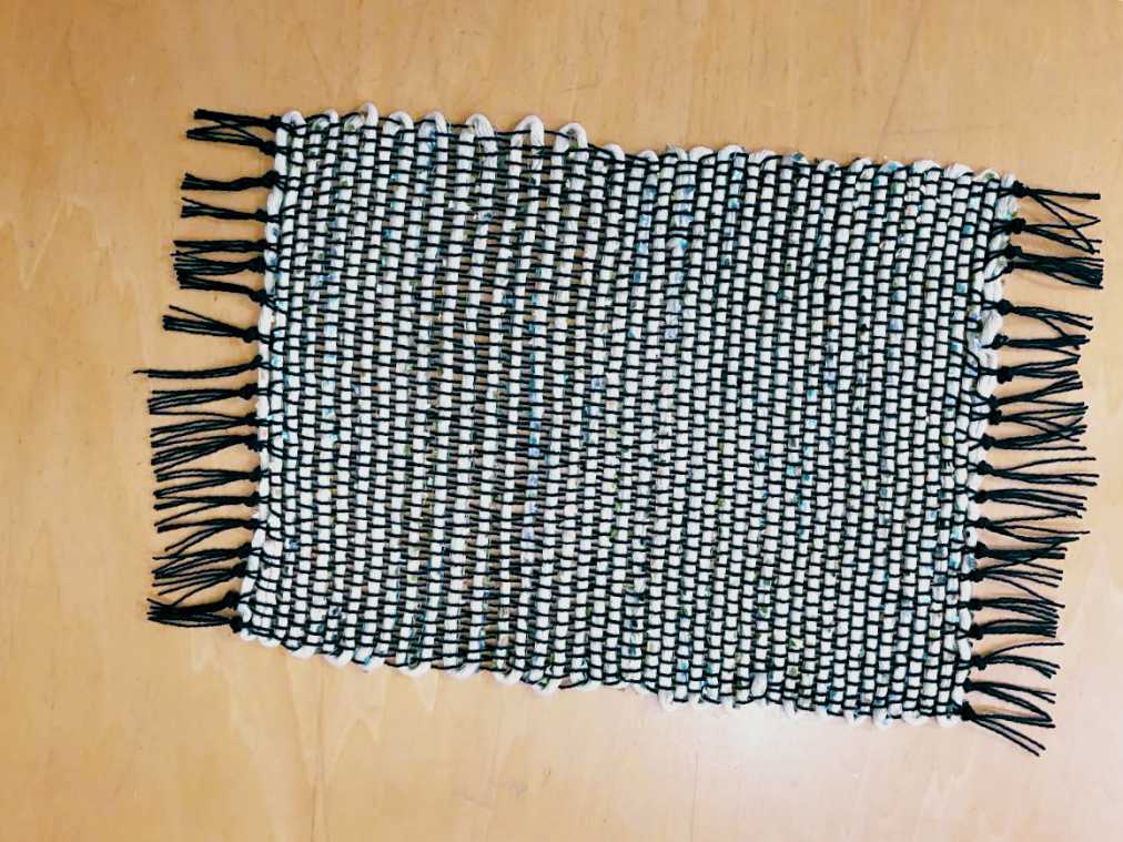 織り終わったらタテ糸のふさを結び、25cm×33cmのマットが完成です。かかった時間はおよそ2時間弱。まったくの初心者なのに我ながらいい出来かも…?これは達成感があります!