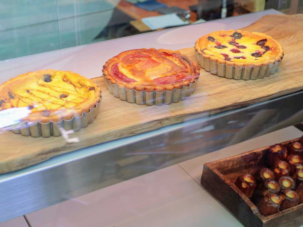 常時タルト3種、キッシュ1種が揃います。左からチョコミントチーズタルト、プラムのタルト、ミックスベリーチーズタルトです。商品はホール(820円)以外にも、ハーフカット(420円)や1/4カット(230円)から購入でき、テイクアウトとイートイン両方可能です。