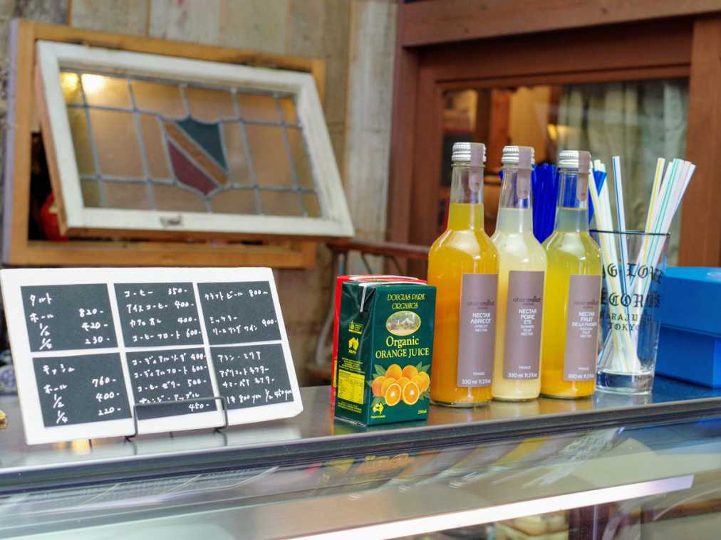 店内にはフランス産のアラン・ミリアのネクター(1本800円、ハーフ400円)や、オーガニックのオレンジジュース(450円)も並びます。どれもオーナーが強く推す絶品ドリンク。
