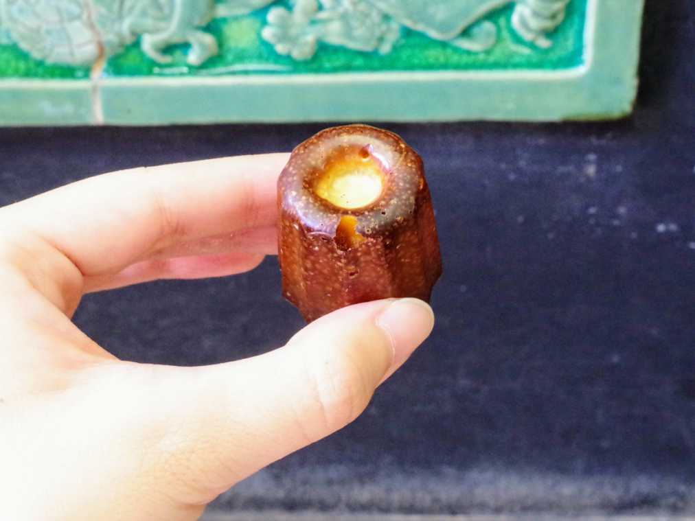 一口サイズのカヌレは指でつまんでパクっと一口でいただくのがお約束。バニラビーンズとラム酒の風味が利いていて、表面はカリッと香ばしい食感が新しく、中はもっちりとしています。