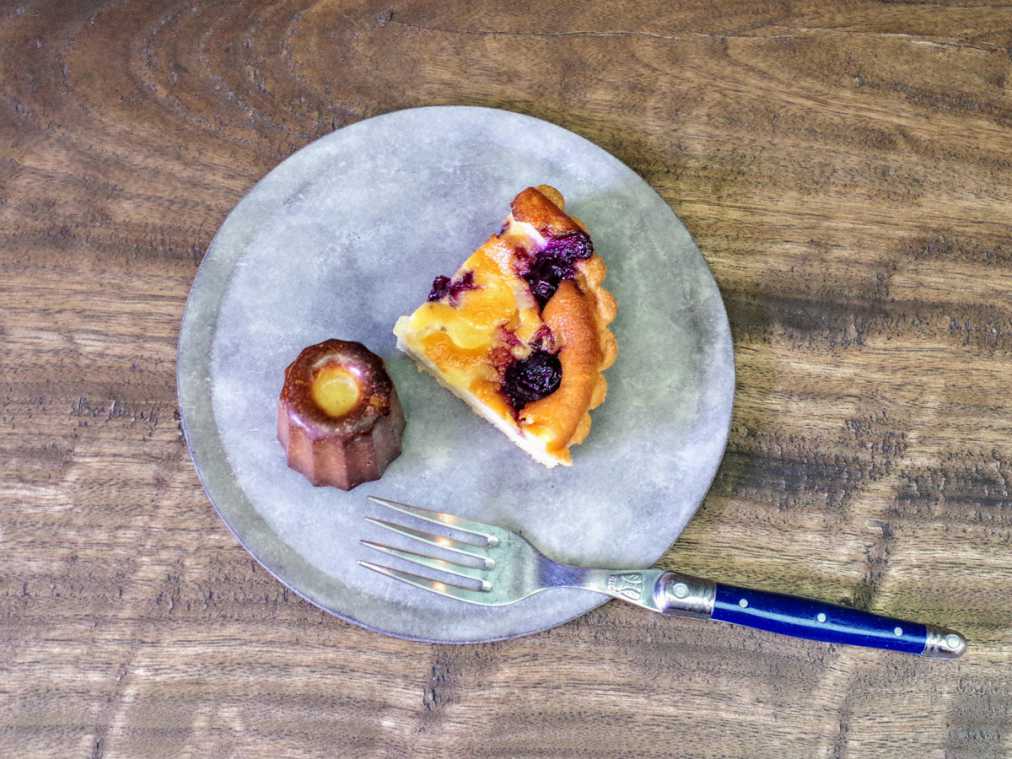 こちらは「ブルーベリーとパイナップルのチーズタルト」(1/4カット230円)とカヌレ(130円)。タルトの生地にはパイナップルピューレが練りこまれ、中にはドライパイナップルとブルーベリーがたっぷり入っています。クリーミーで甘酸っぱいフィリングと、サックサクの生地のハーモニーが絶妙です。