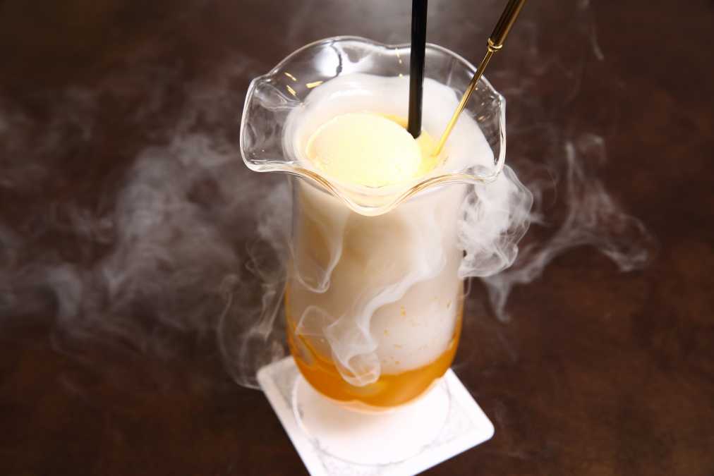こちらは知る人ぞ知る「ポアール」の名物「ミックスジュース」(660円)。実は器が2層になっていて、外側にドライアイスを入れて煙を出しているんです。