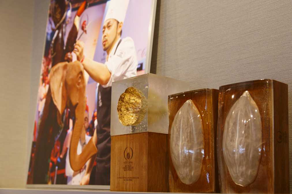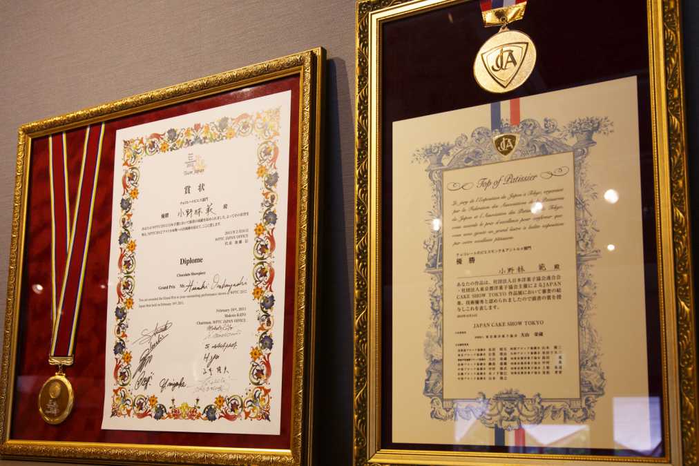 ショーケースの奥には、小野林シェフが世界大会で授与された賞状やトロフィー、写真が並びます。等身大以上の作品も作られるのだと、びっくり!!