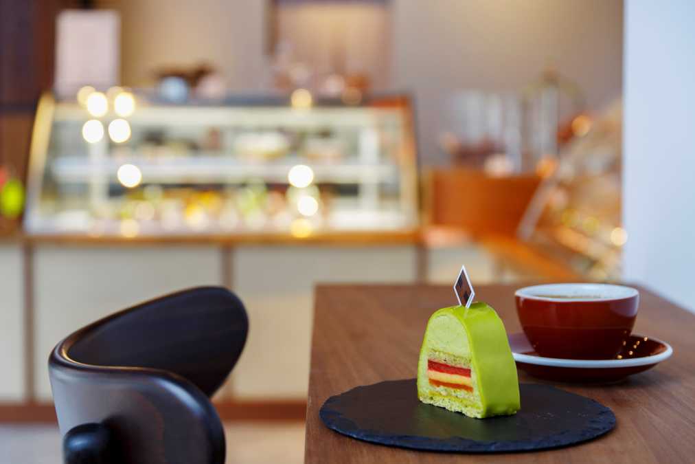 鮮やかなグリーンとボーダー模様がポップなケーキも、2012年の世界大会で発表されたもの。ピスタチオとホワイトチョコレートのムースに、アプリコットのクリームやブラッドオレンジのジュレをサンド。はかない口どけと、多彩な味わいのハーモニーにうっとり。日本人ならクスッとくる愛らしい色や形、ネーミングにも注目です。