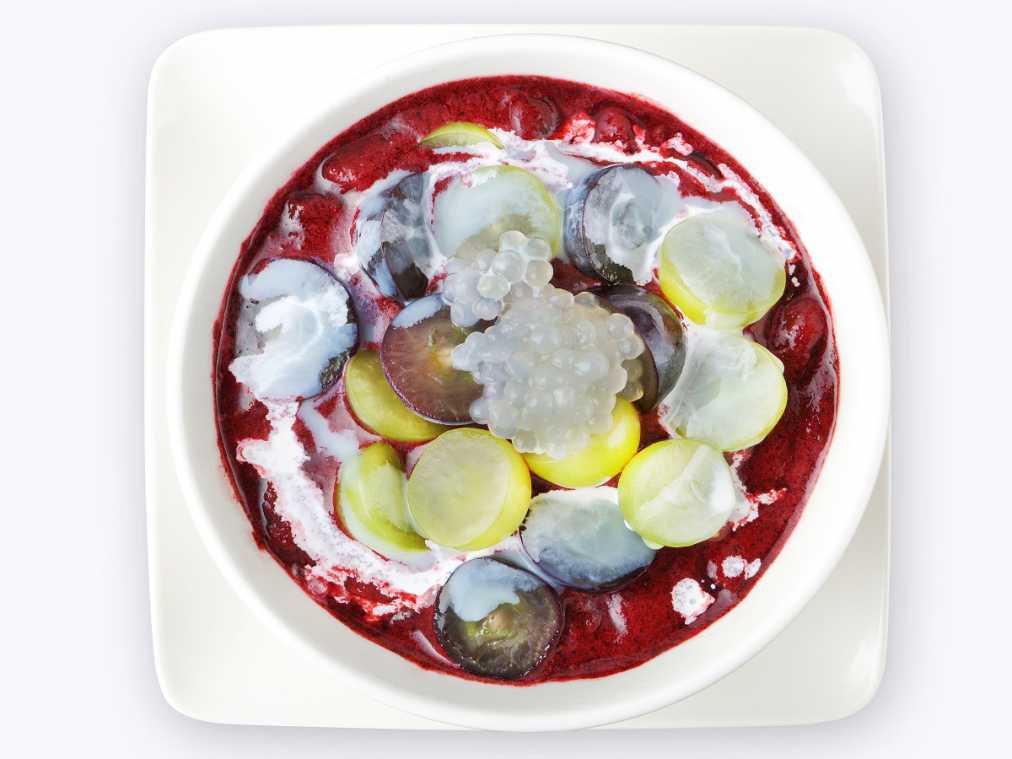 秋ならではの味覚を!「シャインマスカットと巨峰の豆花」1480円は、みずみずしいシャインマスカットと巨峰がたっぷり。