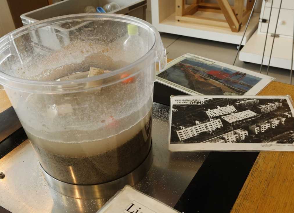 実験ステージでは「液状化」について、ボランティアが装置を使って説明をしてくれます。地震に見立てて装置を揺らすと、水が浮き、地面が分離。ビルに見立てた建築物が埋もれて倒れていき、地中にあったボールが浮かび上がって…。ニュースで聞いたことのある「液状化」がどんなものか、目で見て実感することができます。