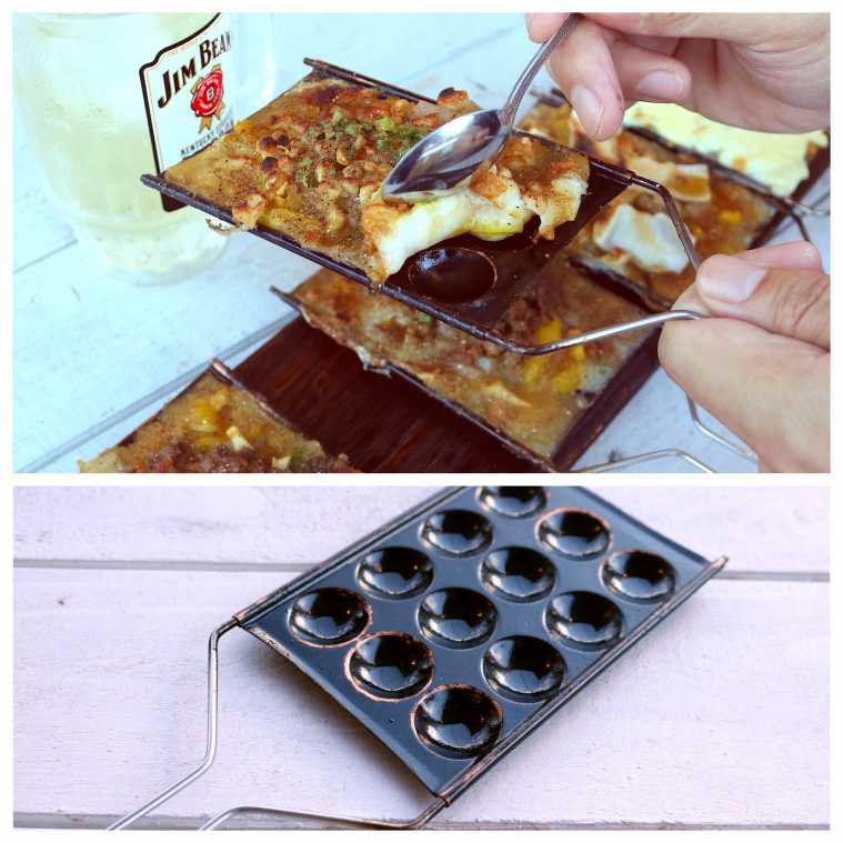昭和の頃、駄菓子屋さんで子ども向けのおやつとして売られていた「ちょぼ焼き」は、たこ焼のルーツともいわれています。たこ焼プレートをミニチュアにしたような器を片手にもって、くるんとめくりながらいただきます。