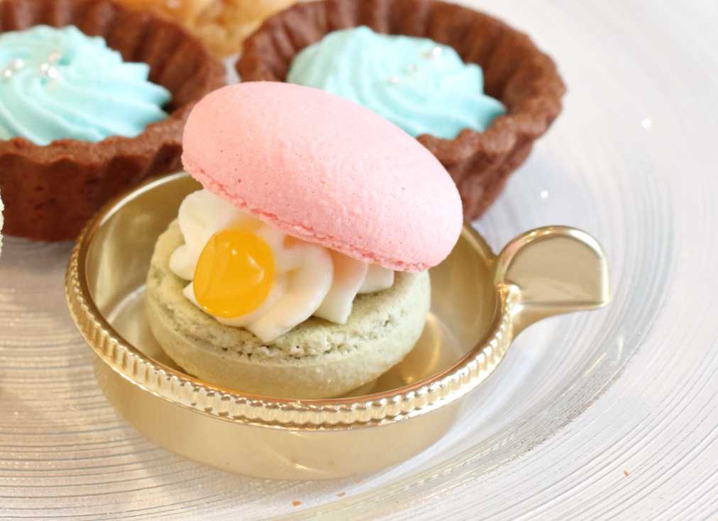 「真珠貝のマカロン」は、フランボワーズ味とピスタチオ味のマカロンの間に生クリームをサンド。真珠貝に見立てたマンゴーゼリーがあしらわれています。口の中でほどけるようなマカロンの食感もたまりません。
