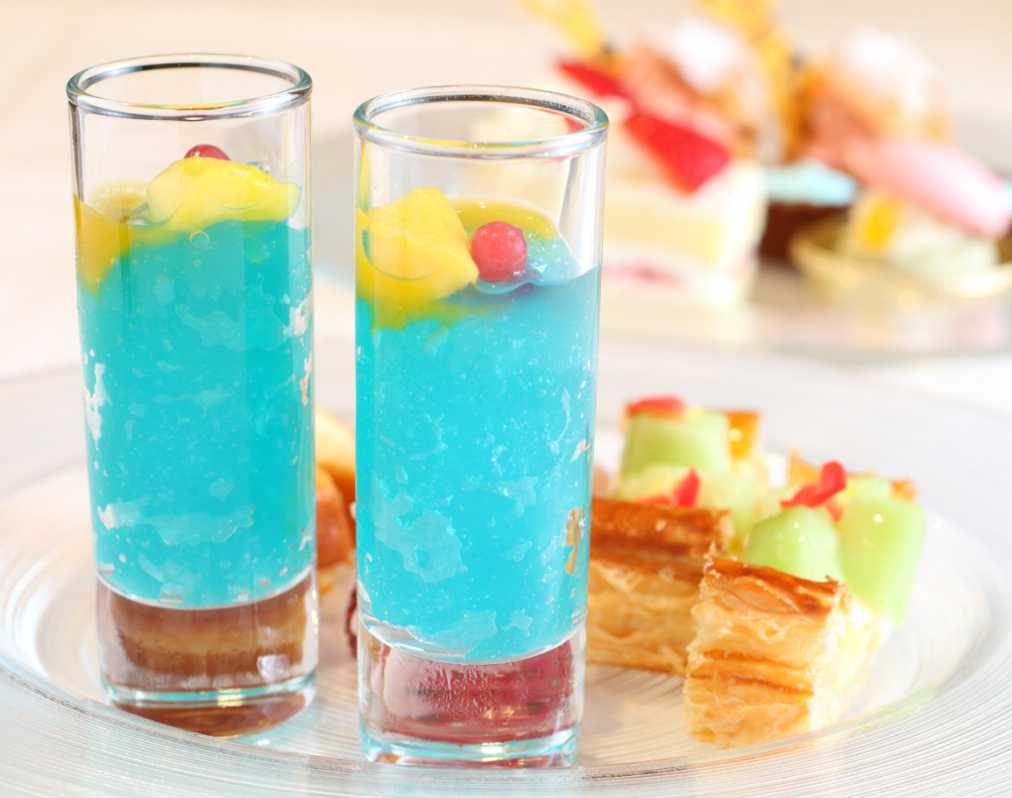爽やかなブルーが印象的な「マーメイドジュレ」は、大海原を泳ぐ魚の群れをイメージ。上にのせたパイナップルのほどよい酸味と相性バツグン。
