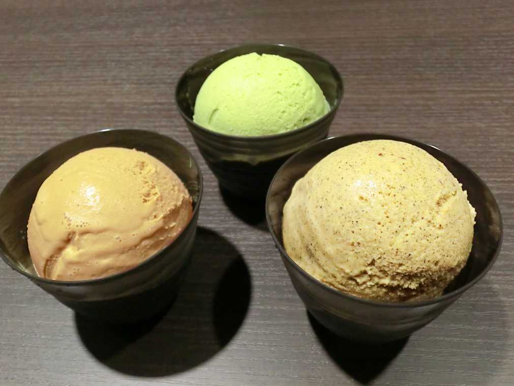 ほかにもぜひ味わってほしいのが、お茶屋さんならではのジェラートメニュー。左から時計回りに「ほうじ茶」、「玄米茶」、「和紅茶」(すべてシングル・カップ370円)です。どれもうっとりするほどお茶そのものの風味が楽しめて、女性に大人気!