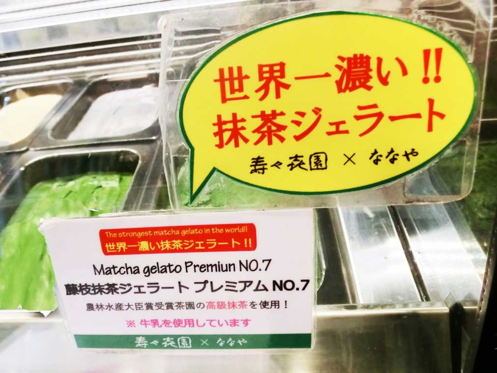 今回、お目当ての最高ランクの濃度まで抹茶を加えた「抹茶プレミアムNO.7」を発見しました!NO.1~6の抹茶ジェラートに使っている抹茶とはレベルが違う、農林水産大臣賞を受賞した1キロ15万円もする超高級抹茶を使っているんです。