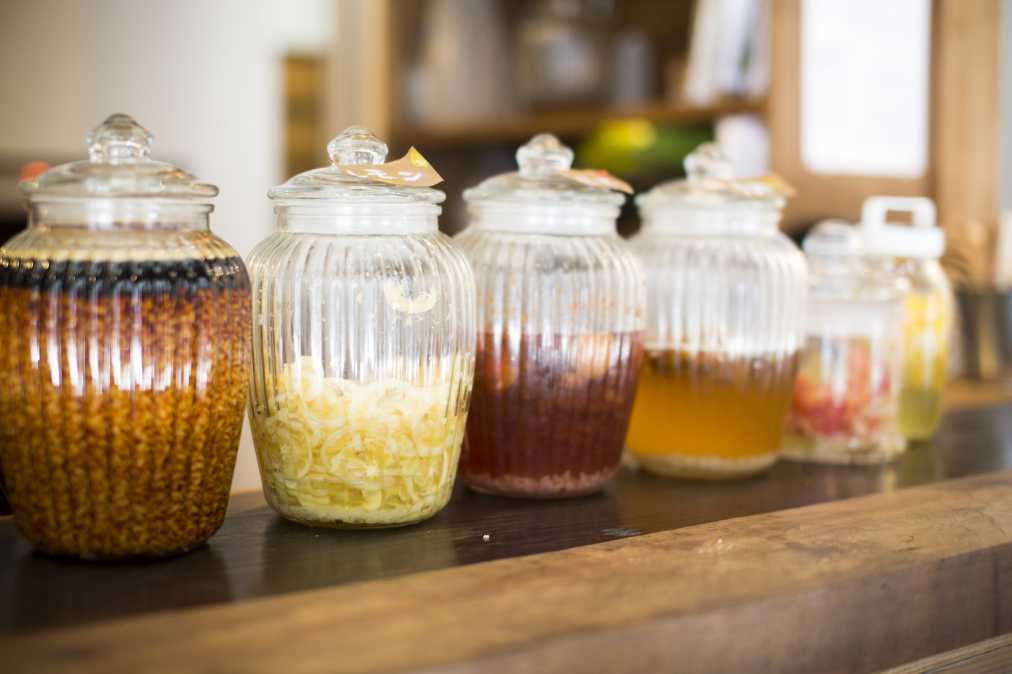 カウンターにはお店で漬けている「醤油麴」のほか、米麴とフルーツを漬け込んだシロップがずらり。レモンやパイン、数種類のフルーツミックスなど、季節に合わせて内容が変わります。