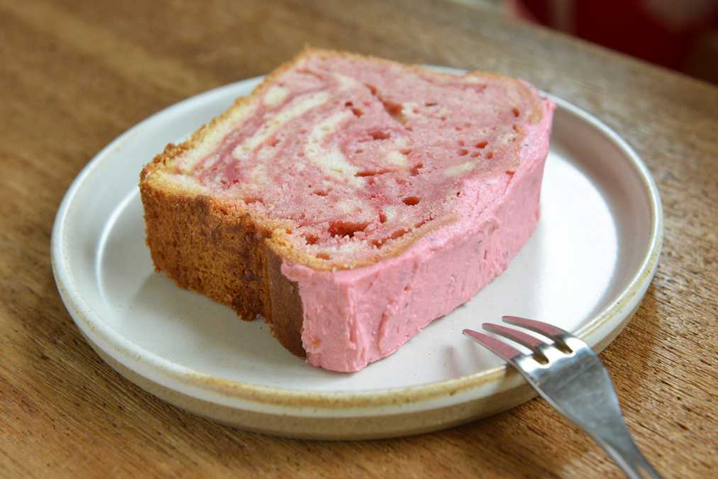イチゴペーストをたっぷりと練りこんだ「いちごのマーブルパウンド」(432円)はサーブされた瞬間、思わず胸キュンしてしまいそう!トップには、クリームチーズにいちごを加えたクリームを使用し、味のアクセントになっています。