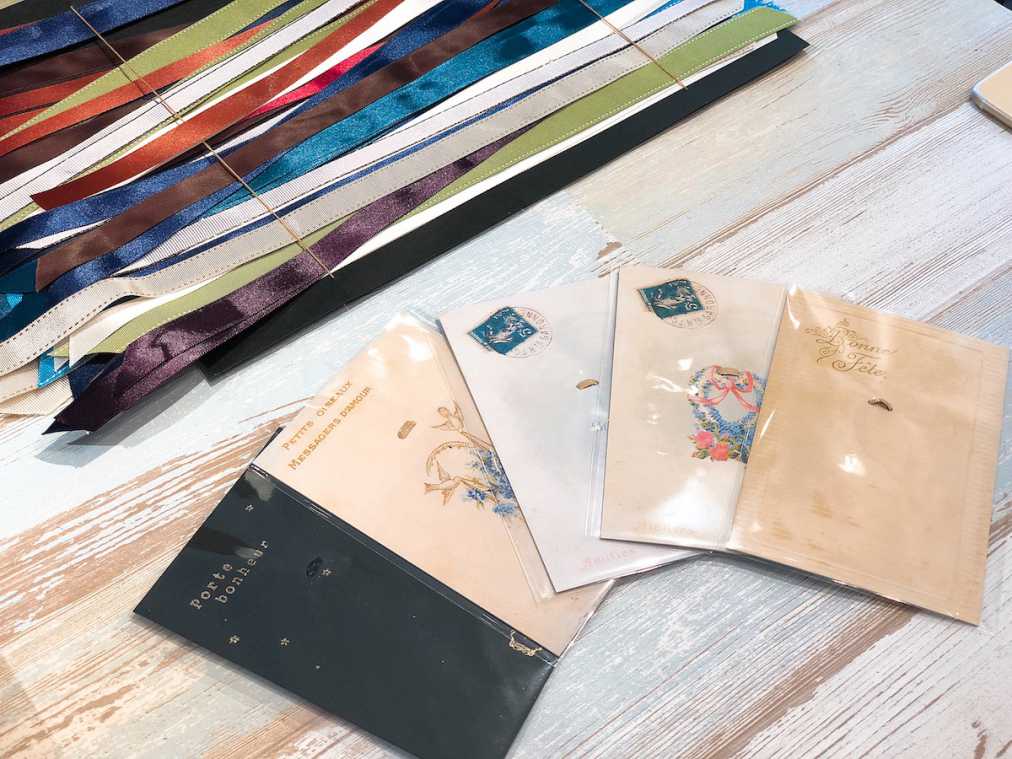 2つ分の流し込みを終えて、アロマワックスのラッピング用の台紙とリボンを選びます。種類が豊富なので必ず自分好みの1つを作れること請け合いです。