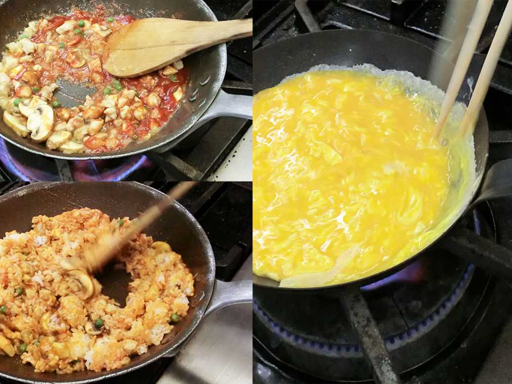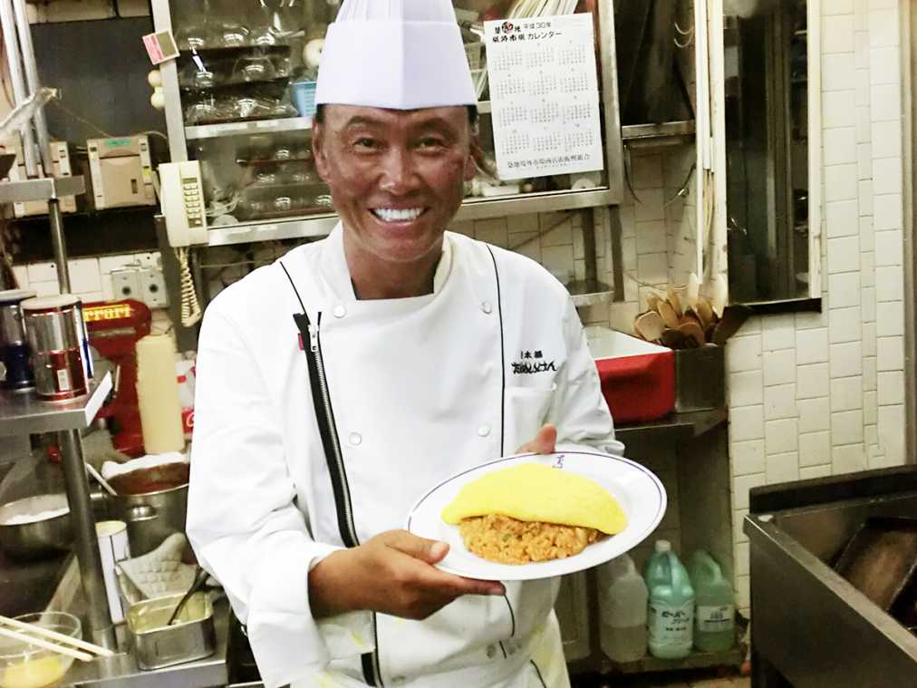 今回、オムライスを作る様子を特別に見せていただきました。チキンライスの具はケチャップで煮込むのが、まろやかに仕上げるコツだそう。オムレツ1人分には卵3個を使い、強火で手早く焼きあげていました。お見事!