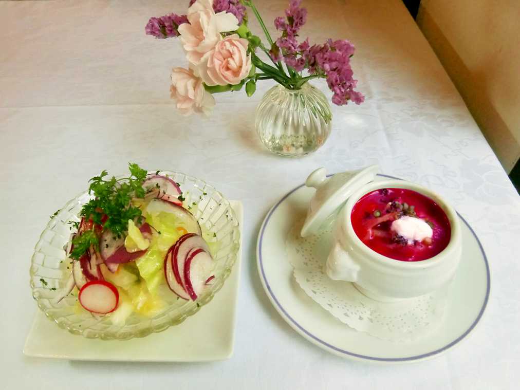 ちなみに1階ではこの2品は各50円で提供していますが、味も見た目もまったく別もの。例えば1階のボルシチはミネストローネのようですが、2階ではビーツがたっぷり入っている、本格的なロシア料理。材料、作り方、手間のかけ方、魅せる演出までレベルが段違いなんです。