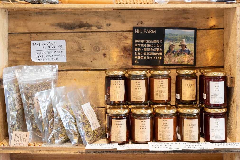 ナチュラルな店内に入ると、ジャムや調味料、クッキーが並ぶ棚が目に入ります。どれも素材の一つに必ず神戸のものを使う、がルール。商品の近くには生産者の顔写真と説明が付いているので、安心感は抜群。神戸で農業を営むご夫婦、NIU FARM(ニウファーム)さん手作りのジャムや調味料は地元の人に人気の商品です。