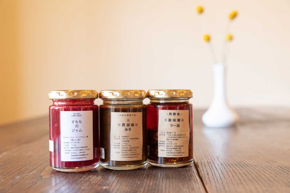 左からすもものジャム900円、黒胡椒みそ980円、薬味麹ラー油1100円。すもものジャムはフルーツのフレッシュ感がスゴイ!黒胡椒みそやラー油も香辛料が絶妙に合わさった奥深い味で、一般に出回っているものとはひと味もふた味も違います。