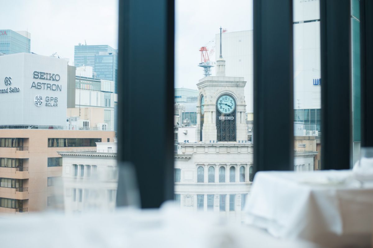 窓の外には、銀座のシンボルともいえる「和光の時計塔」も。日が落ちると時計塔や周囲のビルに明かりが灯り、ロマンチックな景観に一変します。