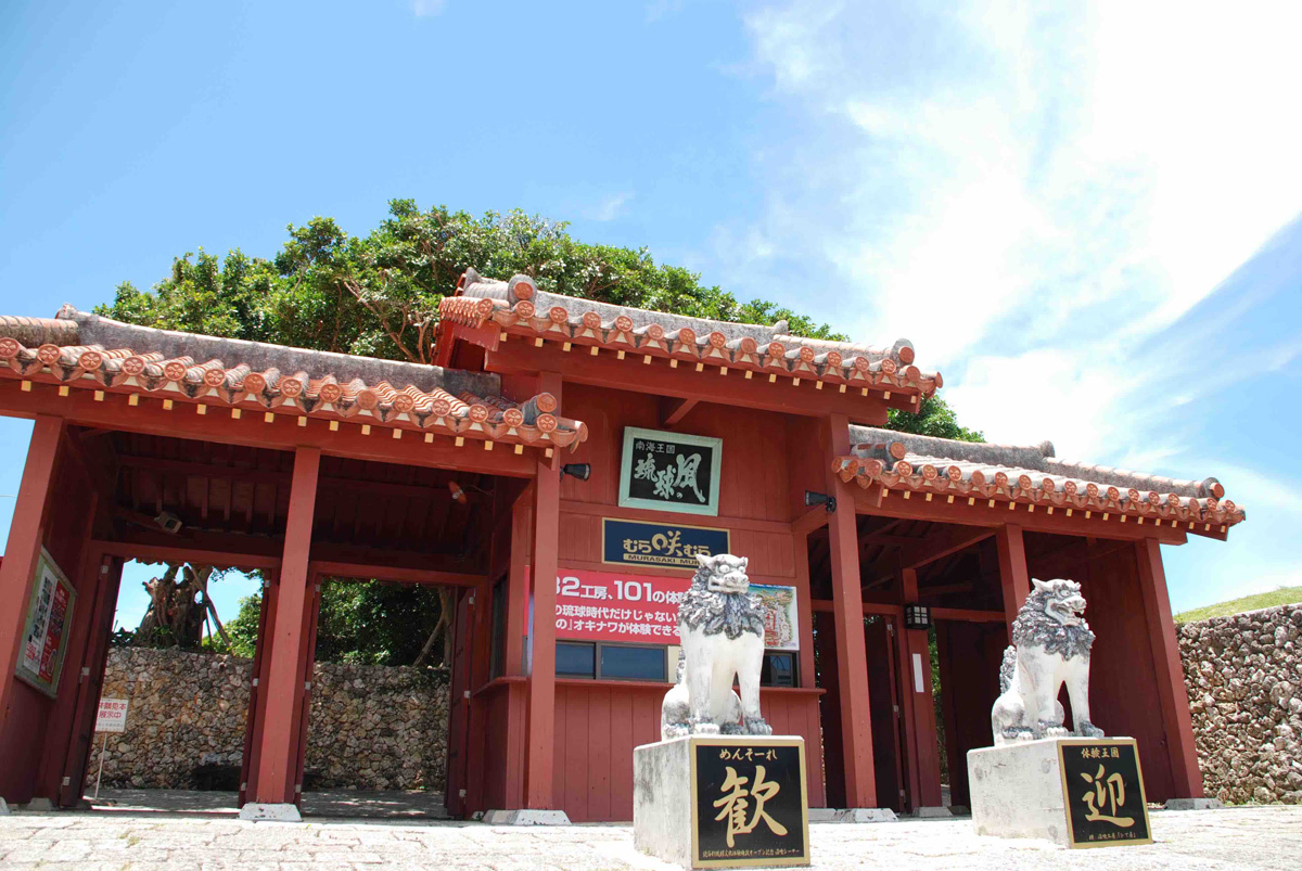 マリンアクティビティを終えたら、30分ほど車を走らせて読谷村の「体験王国 むら咲むら」へ!もともとNHKの大河ドラマ「琉球の風」のセットとして使用された場所ですが、現在では沖縄の文化・芸能・芸術を体験できるテーマパークへと生まれ変わり、たくさんの観光客を楽しませています。