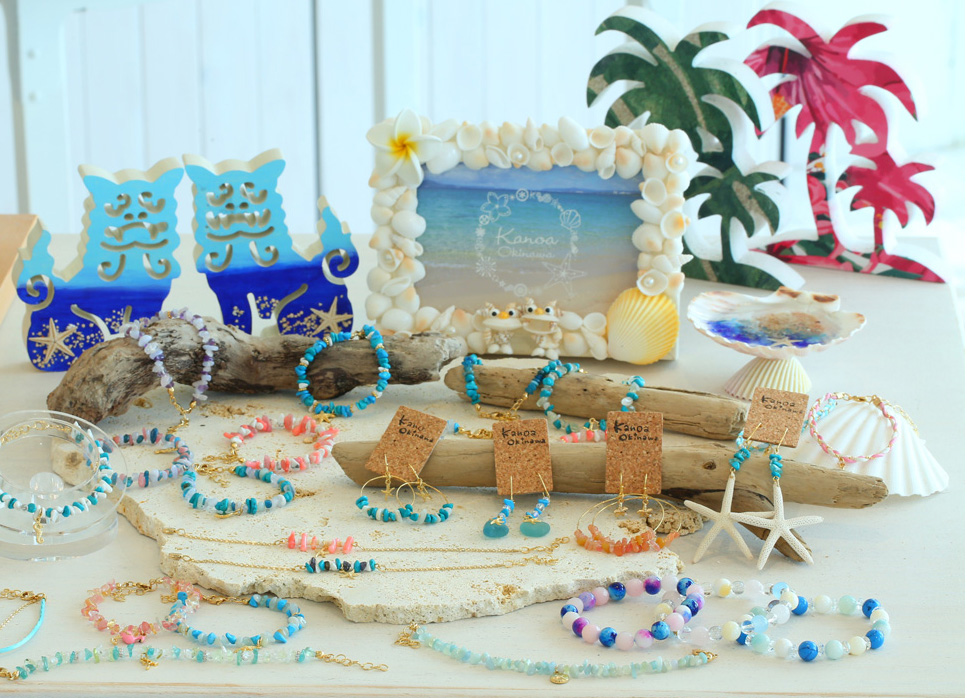 体験教室以外に、アクセサリーやインテリア雑貨も販売しています。トロピカルな店内のあちこちに並べられた、真っ白な貝殻をあしらったシェルフォトフレームやブレスレット、ピアスなどのアクセサリーはすべてハンドメイド。一個ずつ違う表情をしているので、じっくりお気に入りを選んで。