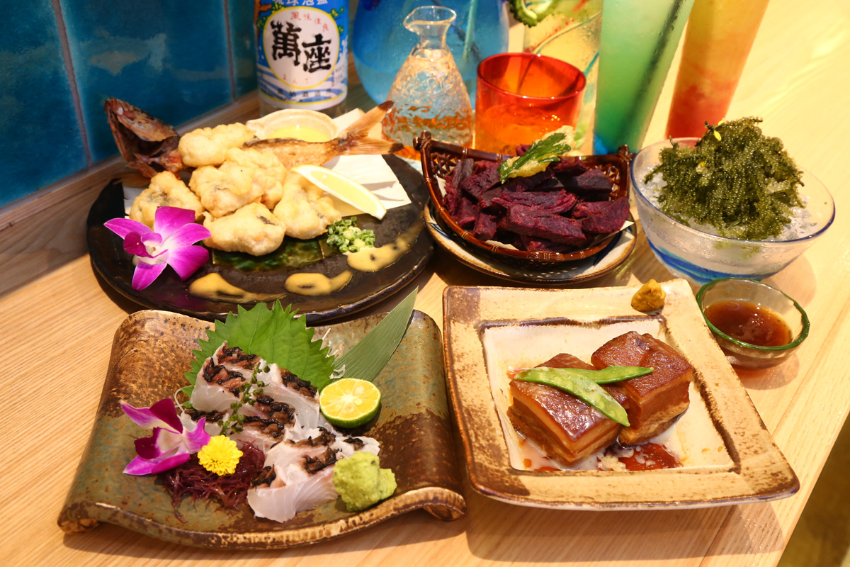 早朝から夕方までアクティビティをたっぷり楽しんだ後は、沖縄料理と泡盛、さらに民謡ライブが堪能できる「ぱいかじ 恩納本店」がおすすめ。泡盛を使ったカラフルな「泡盛カクテル」は女性に人気で、泡盛を初めて飲んでみたい、という人にもぜひためして欲しいドリンク。