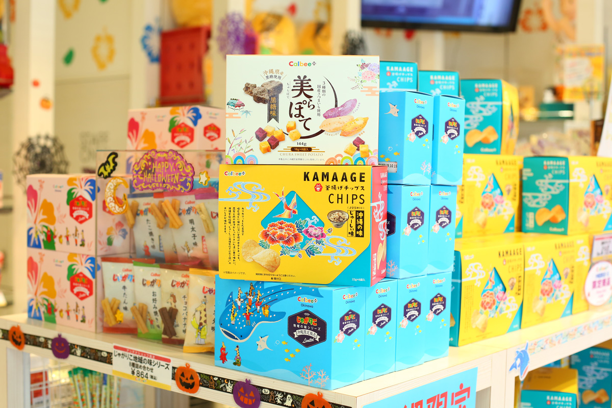 県内唯一のカルビーご当地アンテナショップ。かわいい店内にカルビーのお菓子や雑貨がずらり並びます。中でも、今年から新しく発売されている沖縄限定「釜揚げチップス じゅーしぃ味」(700円)はお土産にイチオシ。カリカリ食感で、沖縄風炊き込みご飯の味わいが口にじゅわっと広がります。