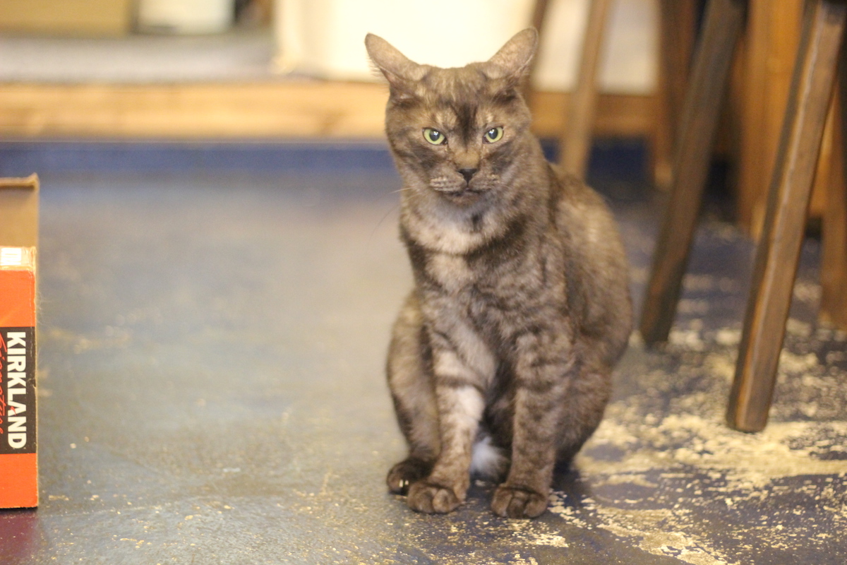 特等席をみつけたかのように座り込む猫も。どの子(猫)もみんなとっても落ち着いているので、ゆったりと食事が楽しめます。