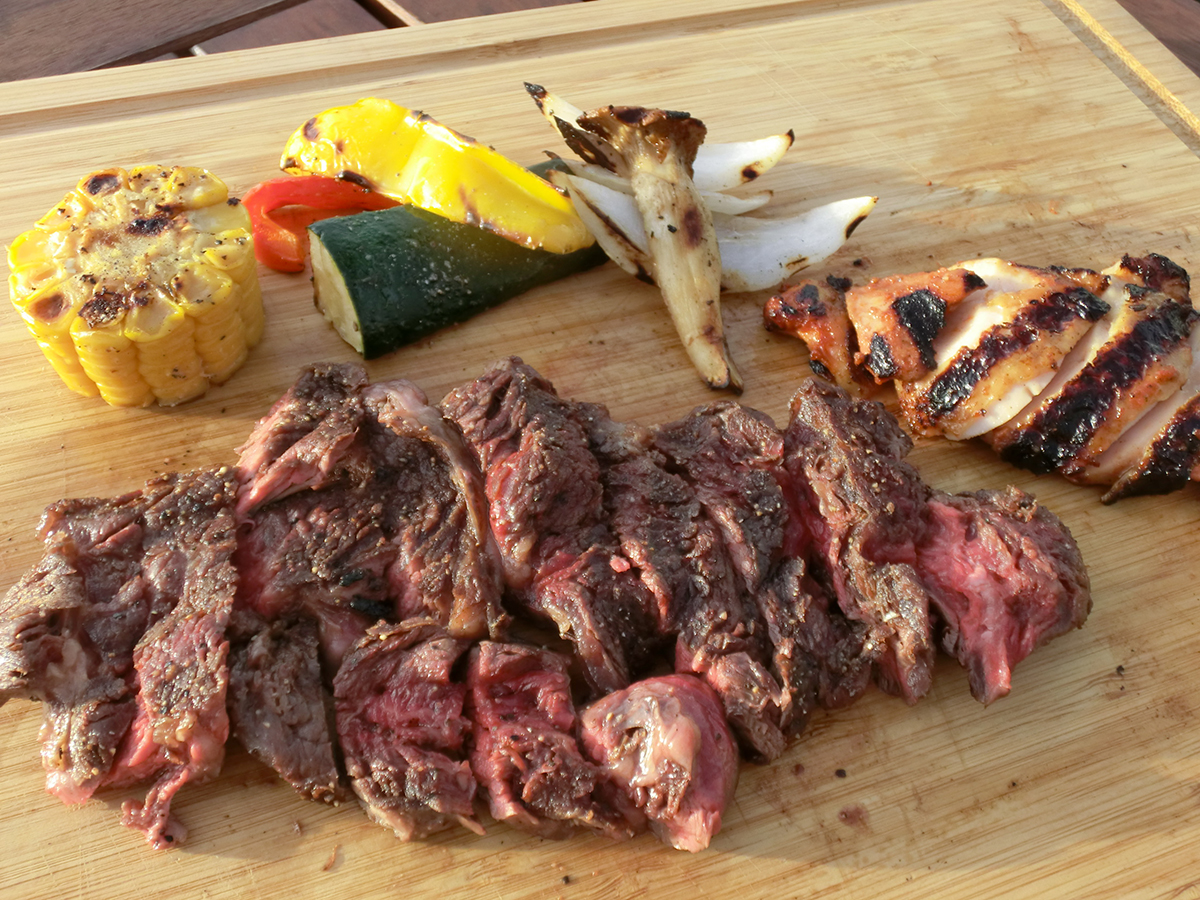 牛肉、チキン、野菜のグリルが完成!こんがりきれいな焼き目がついて、まるでシェフが焼いたみたい。食べてみると、ジュワーッと口の中で肉汁がほとばしる、自分史上最高の焼き具合。野菜もとっても甘くてみずみずしい。焼けた香りも調味料になっていて、塩、こしょうのシンプルな味付けでも十分においしいです!