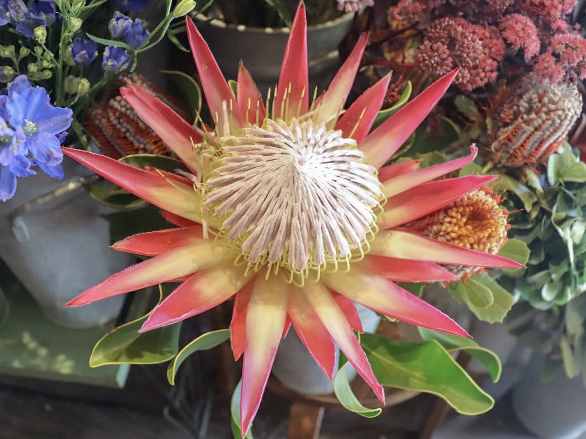 ひときわ目立っていたのは「マディバレット」という大輪のプロテア。鮮やかな赤の色彩と不思議な形に、思わず目が釘付けに!
