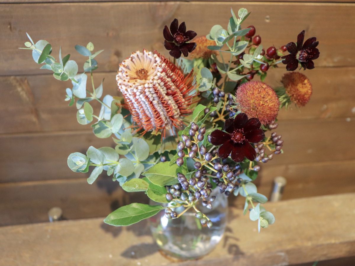 そこにポンポンのようにまぁるい花の「ガイラルディアボール」とひときわ目立つブラシのような花の「ココシニア」をプラス。さらにダークカラーの「チョコレートコスモス」と、グリーンの「ユーカリ」を入れれば、彩りのバランスもGood!