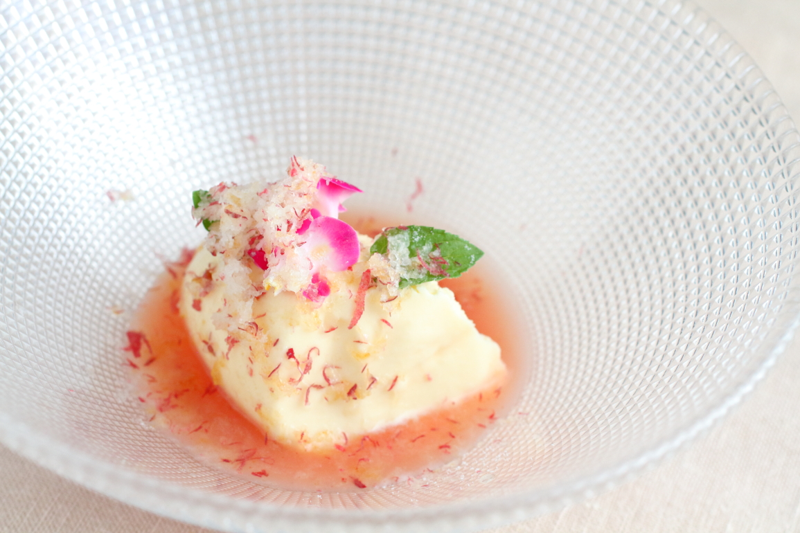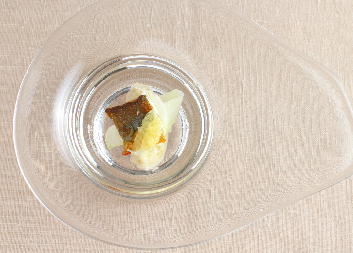 まずは先付けの「鮎とジャガイモのサラダ」。グリルされた鮎とシャキシャキとしたジャガイモが相性バツグン。コースのスタートにぴったりのひと品です。